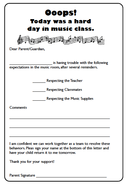 – when a student breaks the social contract, there needs to be a clear but appropriate consequence (time away from the fun instruments, no sticker, frowny face on report for the day, etc.)